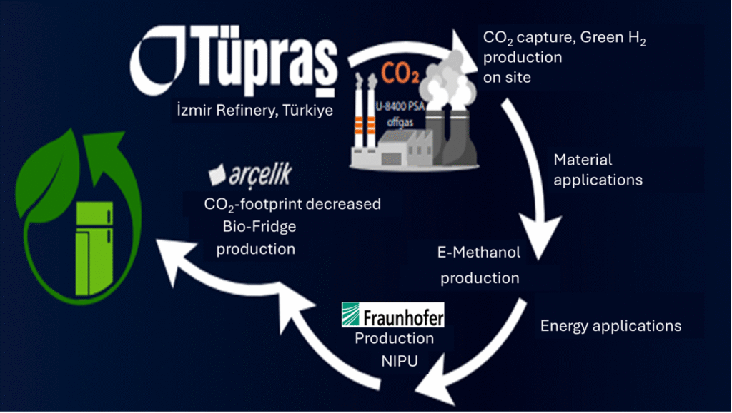 First, hydrogen made by electrolysis from clean electricity is combined with carbon dioxide captured from refining to produce e-methanol on-site. This fuel can be used across several industries, replacing fossil-based inputs. In the Turkish Hub, that same produced e-methanol is used to produce non-isocynate polyurethane, which goes into refrigerators made in the region, reducing the environmental impact of both the process and the product.